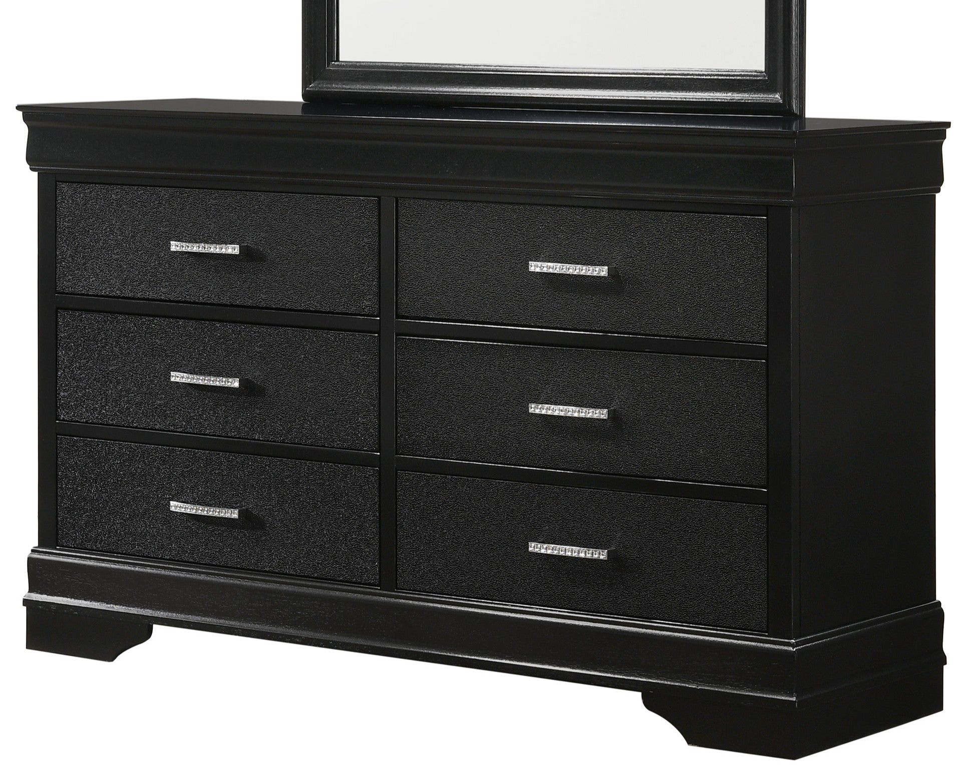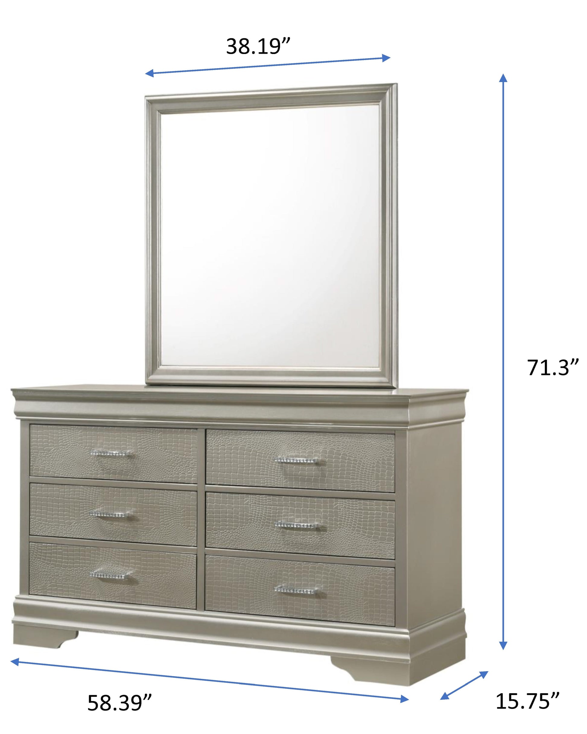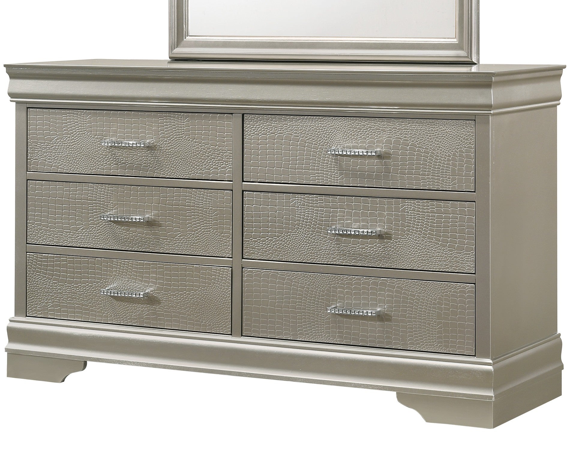 Cette commode Amalia de Crown Mark apporte une touche classique à votre chambre. Elle est dotée de six tiroirs avec poignées métalliques classiques offrant un espace de rangement essentiel. Sa finition argentée sublime son design et s'harmonise avec la plupart des palettes de couleurs.