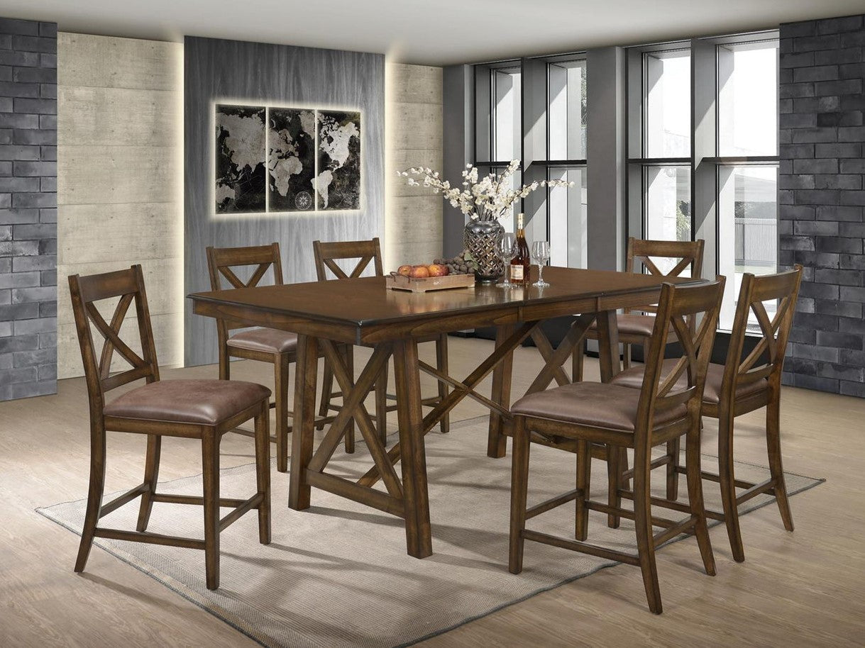 Sublimez votre expérience culinaire avec Edgewood, une magnifique table en bois à la finition chêne bruni et au design unique en « X ». Sa rallonge de 4,5 m offre davantage de places assises, tandis que ses confortables assises en PU marron ajoutent une touche d'élégance. Profitez d'une atmosphère chaleureuse et accueillante avec Edgewood.
