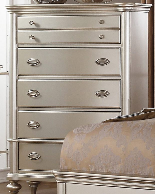 Découvrez la commode F91', un ajout remarquable à toute chambre. Cette commode à cinq tiroirs arbore un mélange de poignées champagne et de boutons ronds pour un look unique et élégant. Sa finition champagne ajoute une touche de luxe à votre espace. Organisez votre chambre avec style !