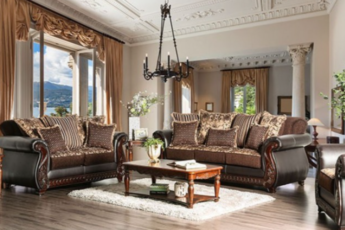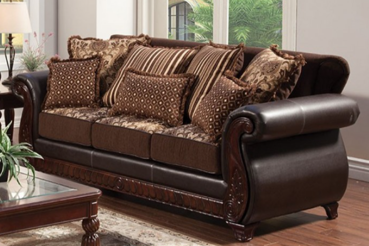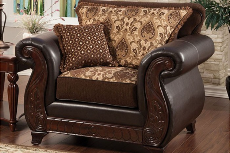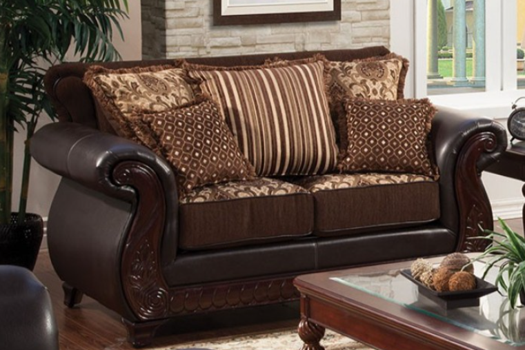 Conquérez votre espace de vie avec le canapé traditionnel marron foncé et la causeuse en tissu beige de Franklin Living. Fabriqué en similicuir et bois massif, cet ensemble comprend des accoudoirs arrondis, des garnitures en bois raffinées et des coussins inclus. Apportez une touche d'aventure à votre intérieur avec ce mobilier audacieux.