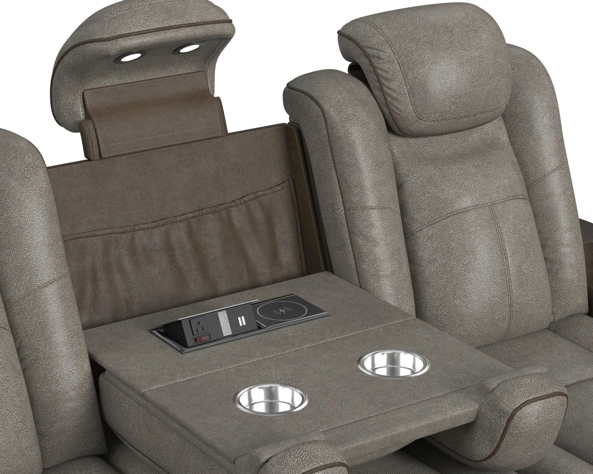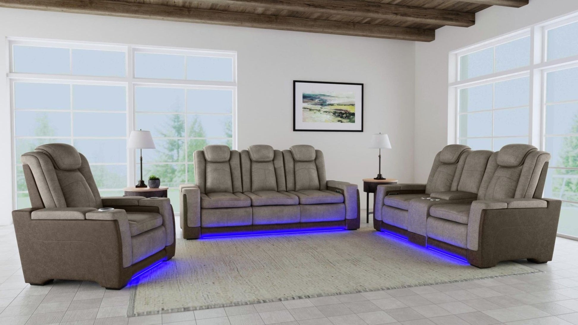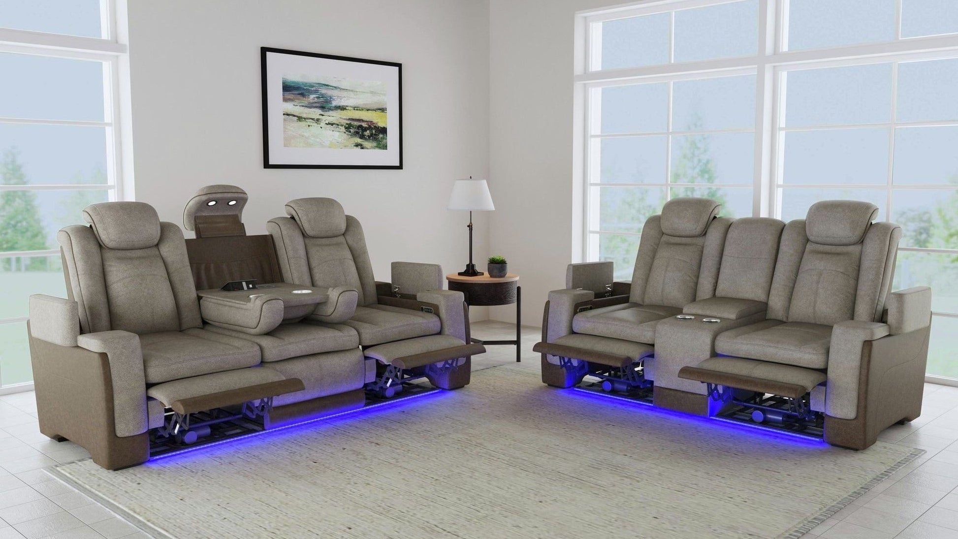 Profitez d'un confort et d'un style ultimes avec l'ensemble canapé et causeuse bicolore Lantana. Doté d'une inclinaison à plat, de lumières LED, de porte-gobelets, d'une recharge sans fil et de compartiments secrets sous les accoudoirs, cet ensemble offre tout le nécessaire pour votre détente et votre confort. Les appuis-tête à réglage électrique et les lumières incluses en font un ensemble idéal pour travailler tard le soir.